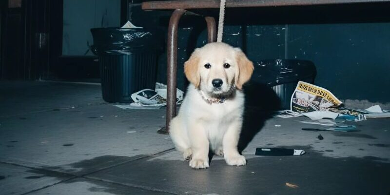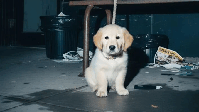 La calle estaba oscura y vacía, llena de tiendas cerradas, cristales rotos y volantes viejos pegados al suelo. Fue entonces cuando la vi. Una cachorrita golden retriever, no más grande que una caja de zapatos, atada a un banco oxidado con una cuerda deshilachada.