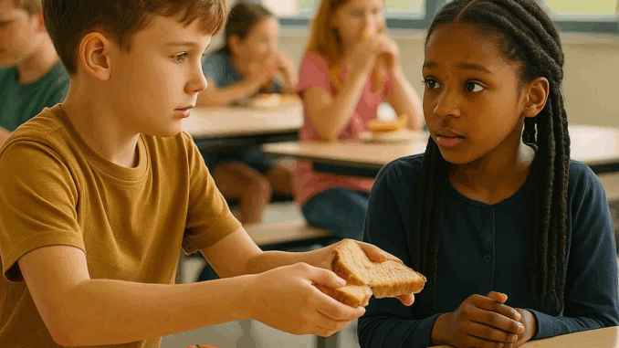 Una niña ofreció la mitad de su barra de granola a un niño que olvidó su almuerzo. Otra compartió su botella de agua con un compañero que se quedó sin ella. Pequeñas muestras de amabilidad comenzaron a extenderse por el patio.