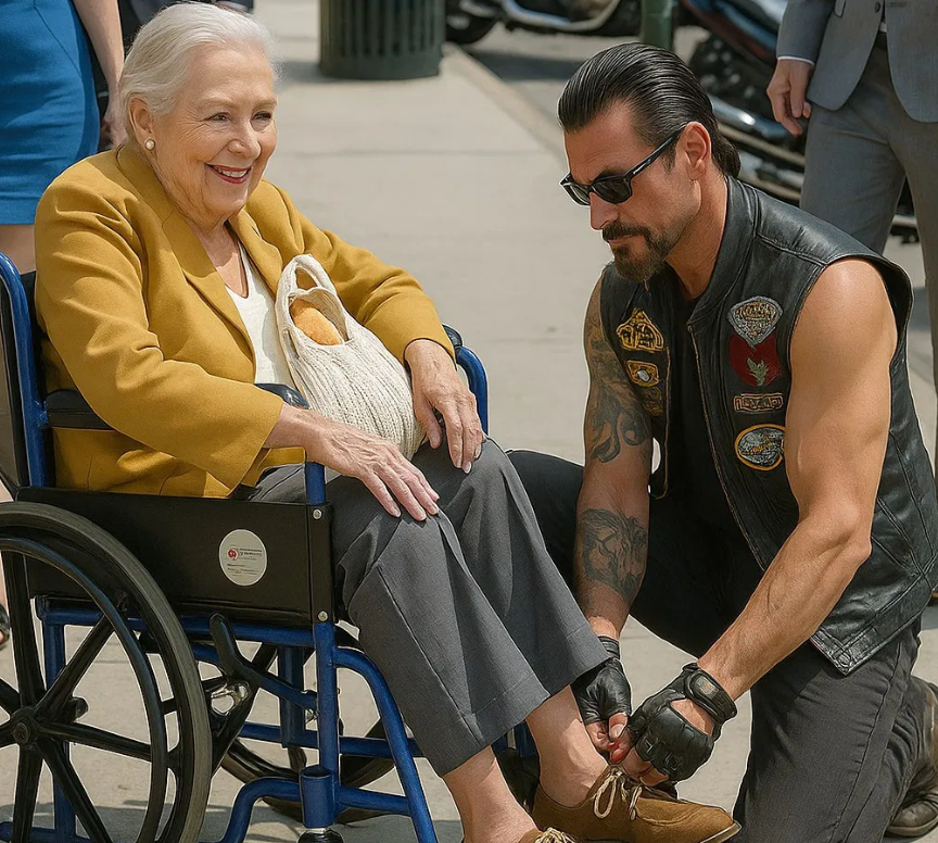 Era un hombre con chaleco de cuero, tatuajes en los brazos y guantes desgastados por la carretera. Se arrodilló en la acera —sin prisa ni enfado— y me ató los zapatos como si estuviera manipulando algo frágil.