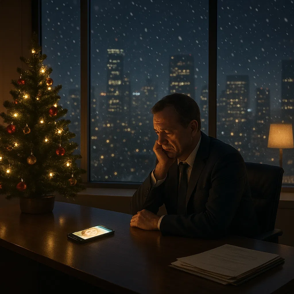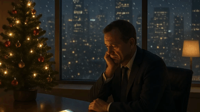La oficina estaba inquietantemente silenciosa, esa quietud que solo se respira en Nochebuena. Afuera, tras los ventanales de Maxwell Industries, los copos de nieve danzaban como plumas, tiñendo la ciudad de blanco. Dentro de la oficina de la esquina, en el piso 32, brillaban cálidas luces amarillas que iluminaban un escritorio meticulosamente cuidado donde el director ejecutivo, Nathaniel Blake, permanecía sentado, encorvado sobre una pantalla que ya no captaba su atención.