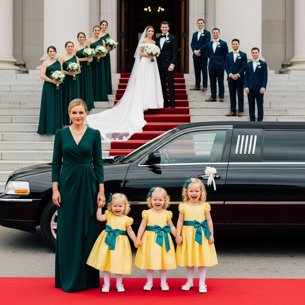 El coche negro se detuvo. El conductor bajó y abrió la puerta con gracia ensayada. Primero salieron tres niñas con vestidos amarillos iguales, tomadas de la mano, con sus rizos ondeando al caminar por la alfombra roja. Detrás de ellas apareció Emma, con un elegante vestido verde esmeralda. Su presencia era imponente y serena, su belleza radiante y su fuerza innegable.