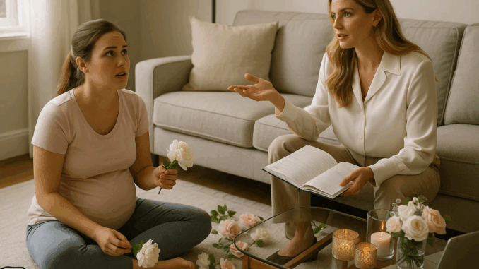 Estaba sentada con las piernas cruzadas en el suelo de la sala de estar de mi hermana, alineando cuidadosamente peonías artificiales en las bases del centro de mesa, cuando ella dio la gran noticia.