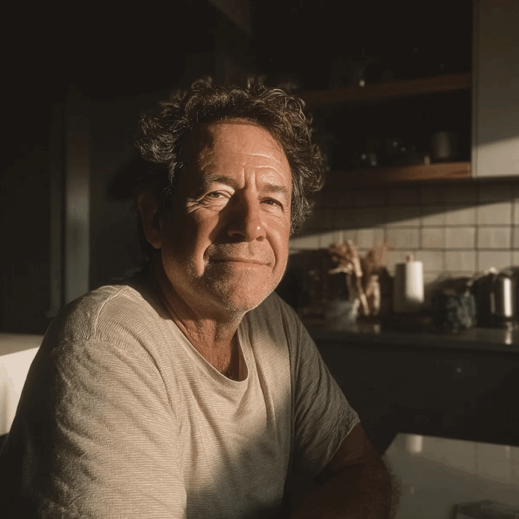 Un hombre sonriente sentado a la mesa de la cocina | Fuente: Midjourney