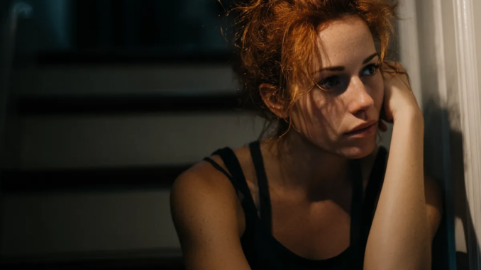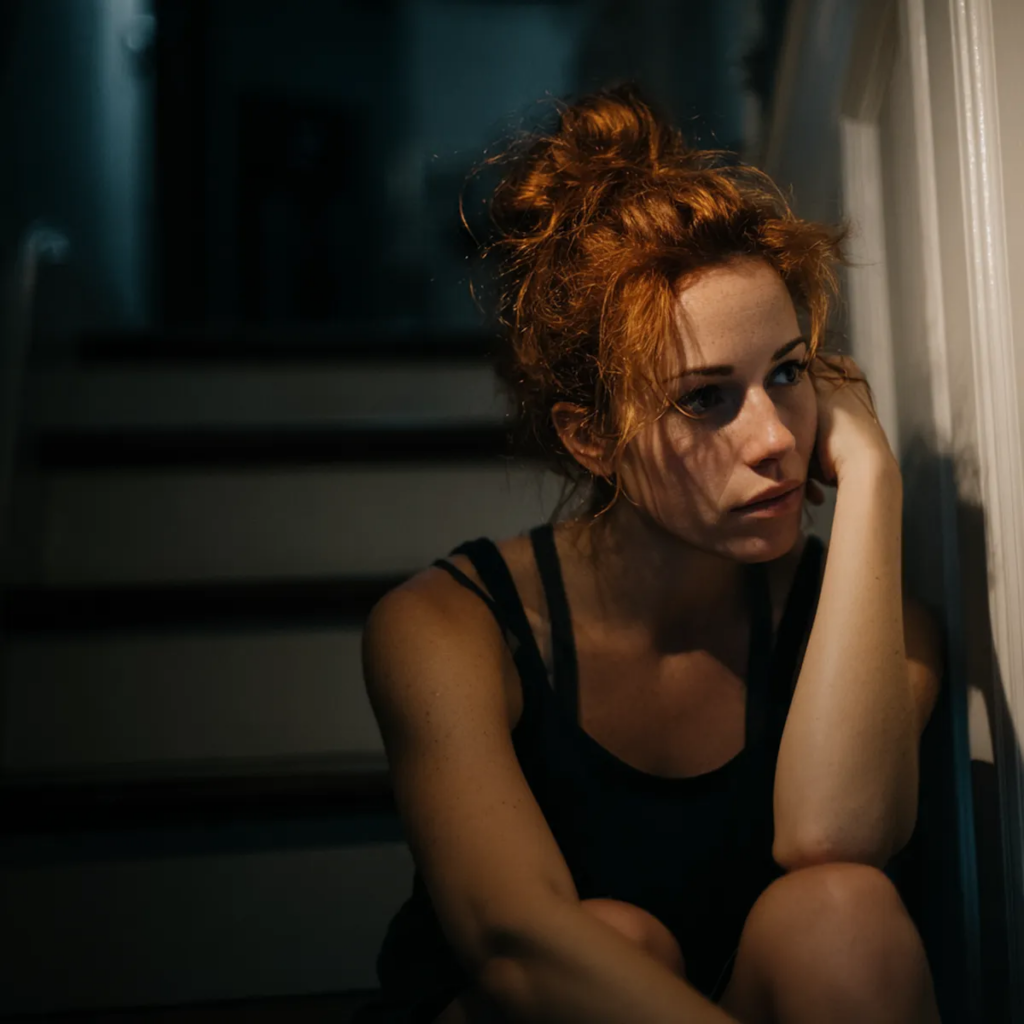 Una mujer emocionada sentada en una escalera | Fuente: Midjourney