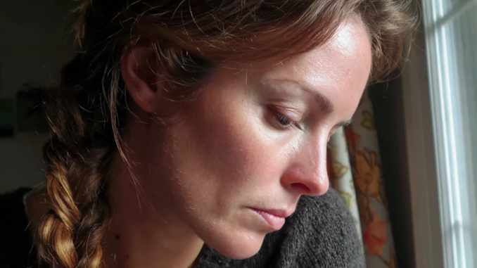 Una mujer alterada sentada junto a una ventana | Fuente: Midjourney