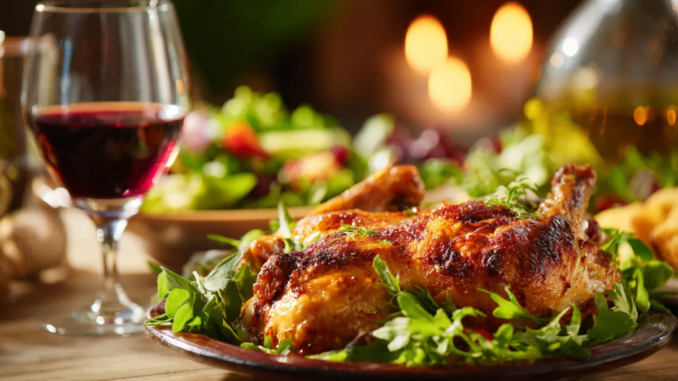Pollo asado servido con ensalada y vino tinto en una mesa | Fuente: Midjourney