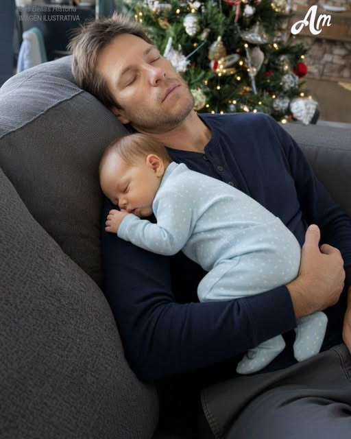 Y al entrar en el salón, me pareció estar viendo cosas: dormido en el sofá, con la cabeza echada hacia atrás y los brazos rodeando a un recién nacido, estaba mi esposo.