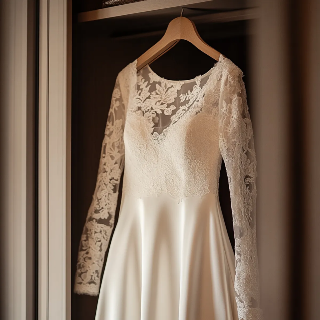 La tela de satén marfil atrapaba la luz como el agua, mientras que las delicadas mangas de encaje parecían hechas por ángeles.